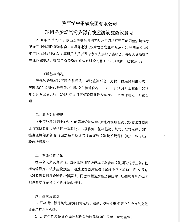 陜西漢中鋼鐵集團有限公司球團豎爐煙氣污染源在線監(jiān)測實施驗收意見